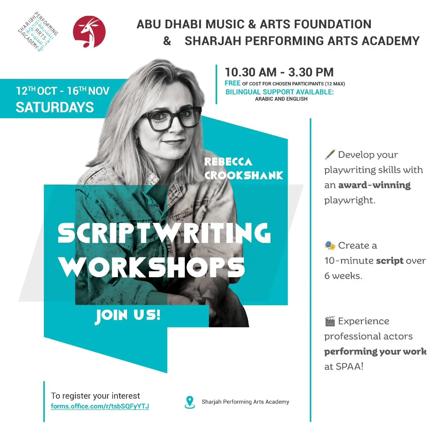 Sharjah Performing Arts Academy (SPAA), in collaboration with the Abu Dhabi Music & Arts Foundation (ADMAF), is excited to announce a free 6-week scriptwriting workshop led by award-winning playwright Rebecca Crook shank. The workshop aims to nurture budding playwrights and bring their stories to life on stage.
